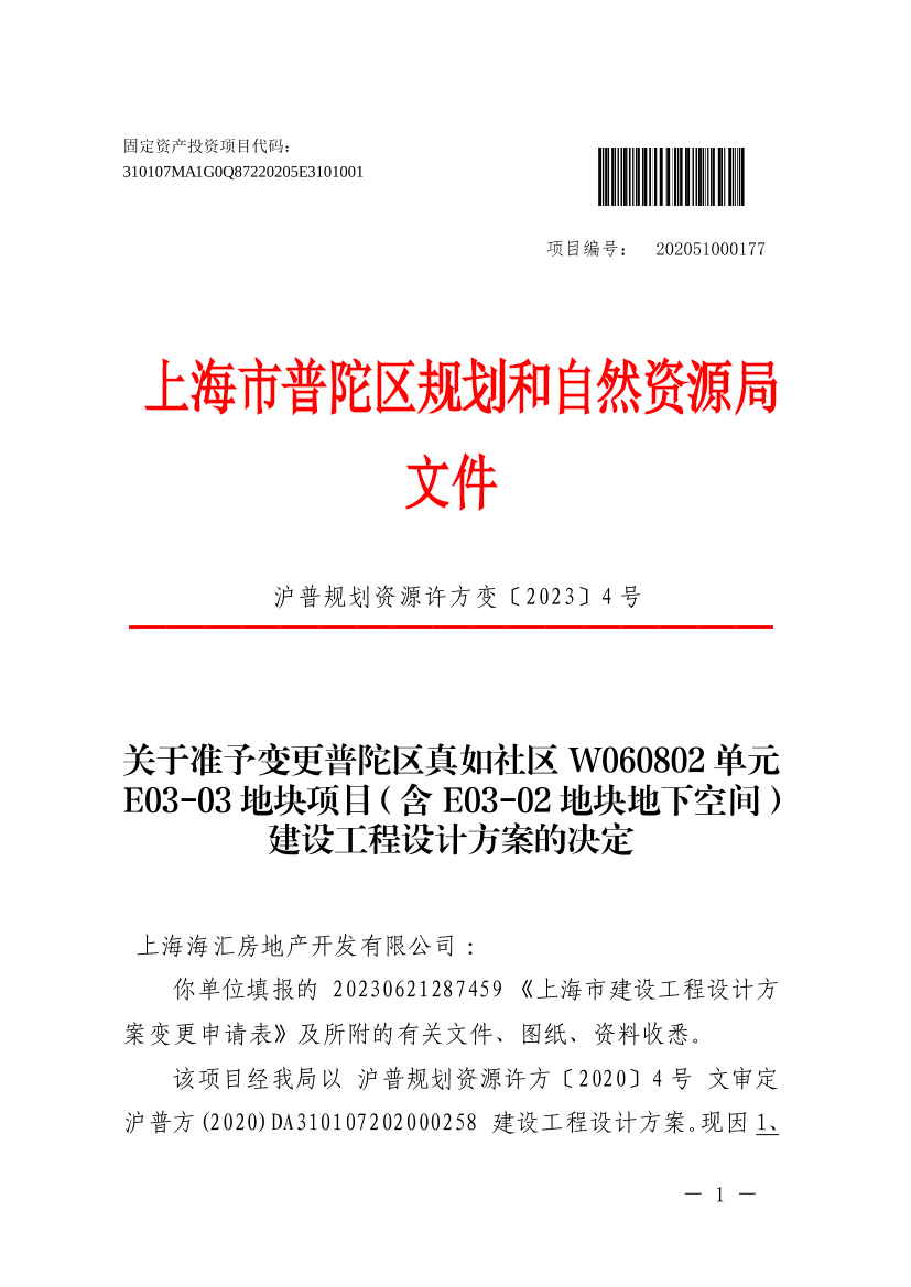 该项目经我局以沪普规划资源许方〔2020〕4号文审定沪普方(2020)DA310107202000258建设工程设计方案。现因1、与南侧F04-01地块地下联通,引起本地块方案调整;2、项目提升需求,方案优化;3、E03-02地下空间一体化设计申报,你(单位)申请对普陀区真如社区W060802单元E03-03地块项目进行变更。