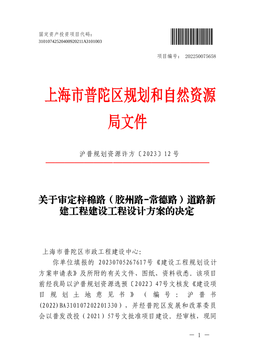 关于审定梓棉路(胶州路-常德路)道路新建工程建设工程设计方案的决定