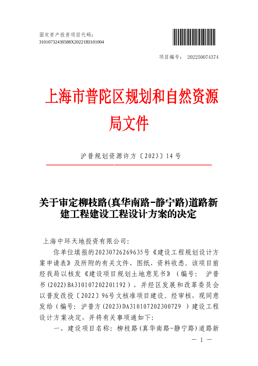 关于审定柳枝路(真华南路-静宁路)道路新建工程建设工程设计方案的决定