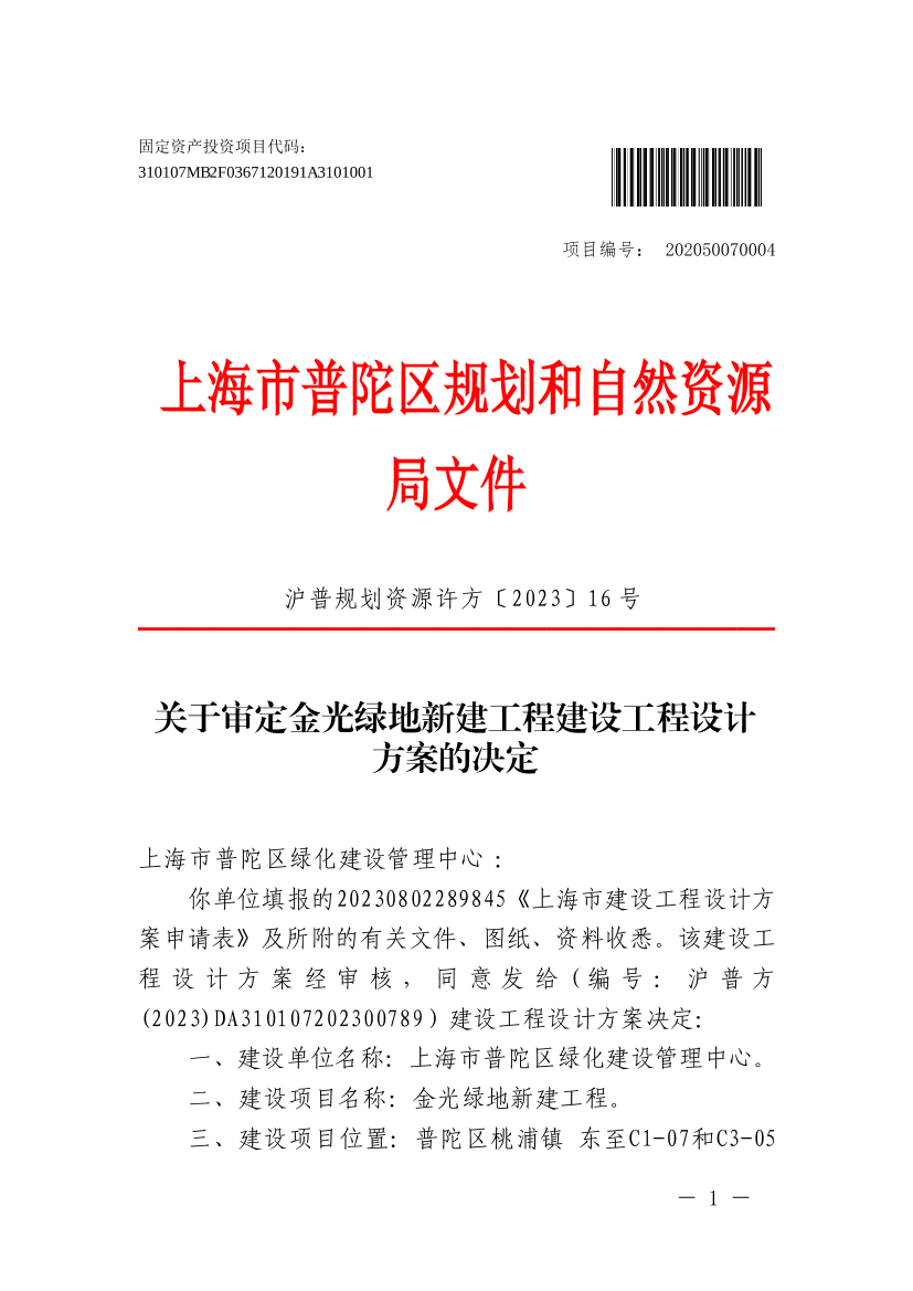 关于审定金光绿地新建工程建设工程设计方案的决定