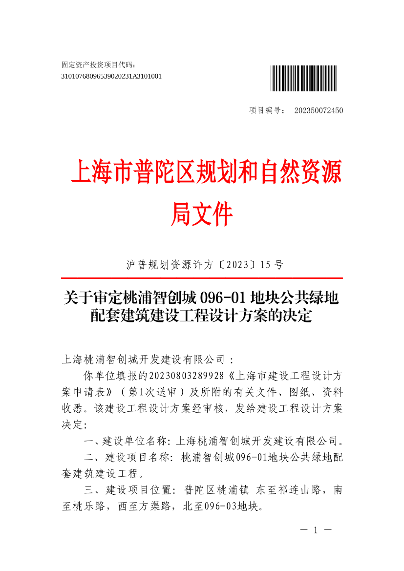 关于审定桃浦智创城096-01地块公共绿地配套建筑建设工程设计方案的决定