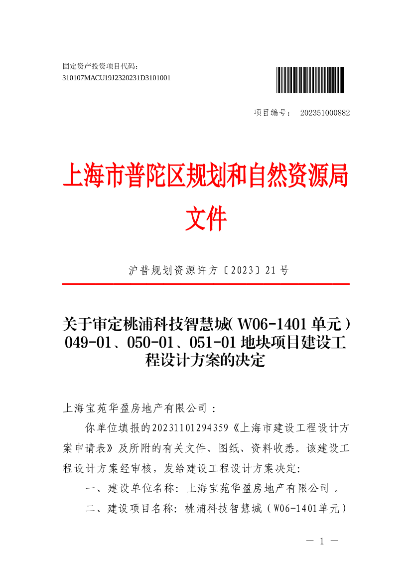 关于审定桃浦科技智慧城(W06-1401单元)049-01、050-01、051-01地块项目建设工程设计方案的决定