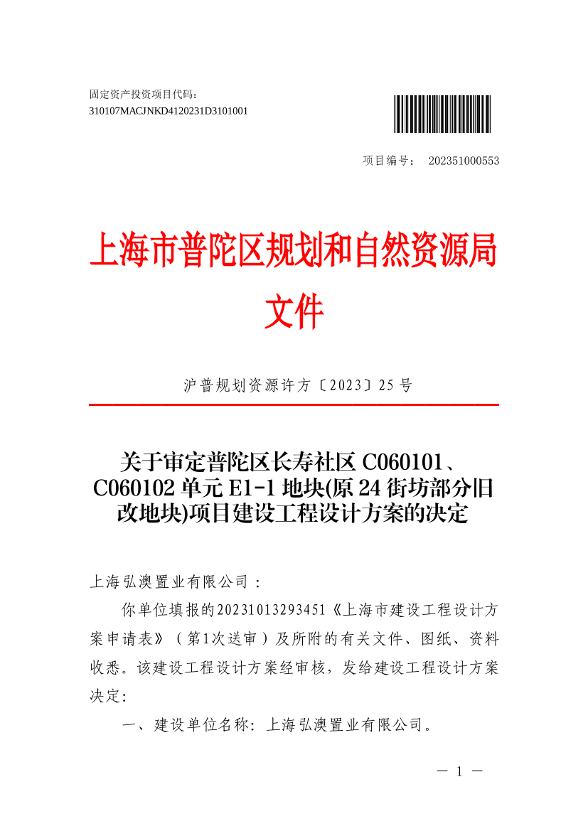 关于审定普陀区长寿社区C060101、C060102单元E1-1地块(原24街坊部分旧改地块)项目建设工程设计方案的决定