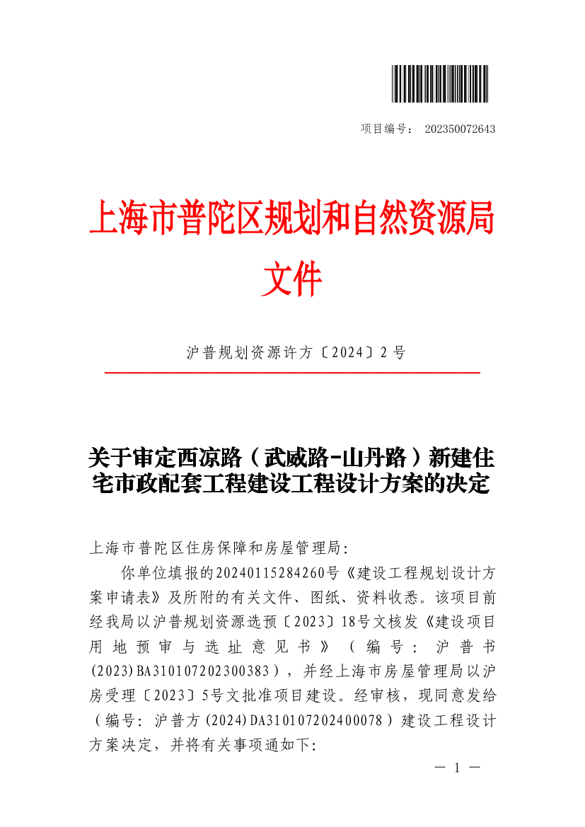 你单位填报的20240115284260号《建设工程规划设计方案申请表》及所附的有关文件、图纸、资料收悉。该项目前经我局以沪普规划资源选预〔2023〕18号文核发《建设项目用地预审与选址意见书》(编号:沪普书(2023)BA310107202300383),并经上海市房屋管理局以沪房受理〔2023〕5号文批准项目建设。经审核,现同意发给(编号:沪普方(2024)DA310107202400078)建设工程设计方案决定,并将有关事项通如下: