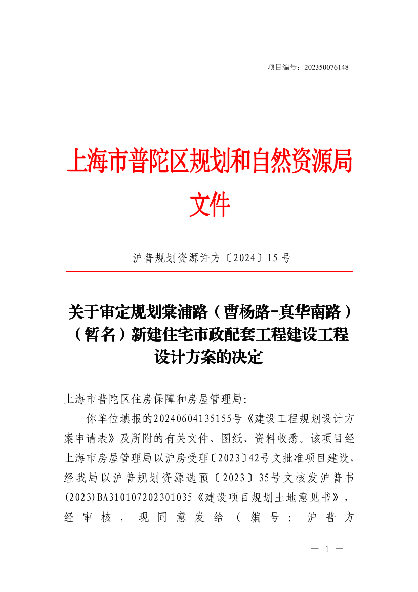 关于审定规划棠浦路(曹杨路-真华南路)(暂名)新建住宅市政配套工程建设工程设计方案的决定