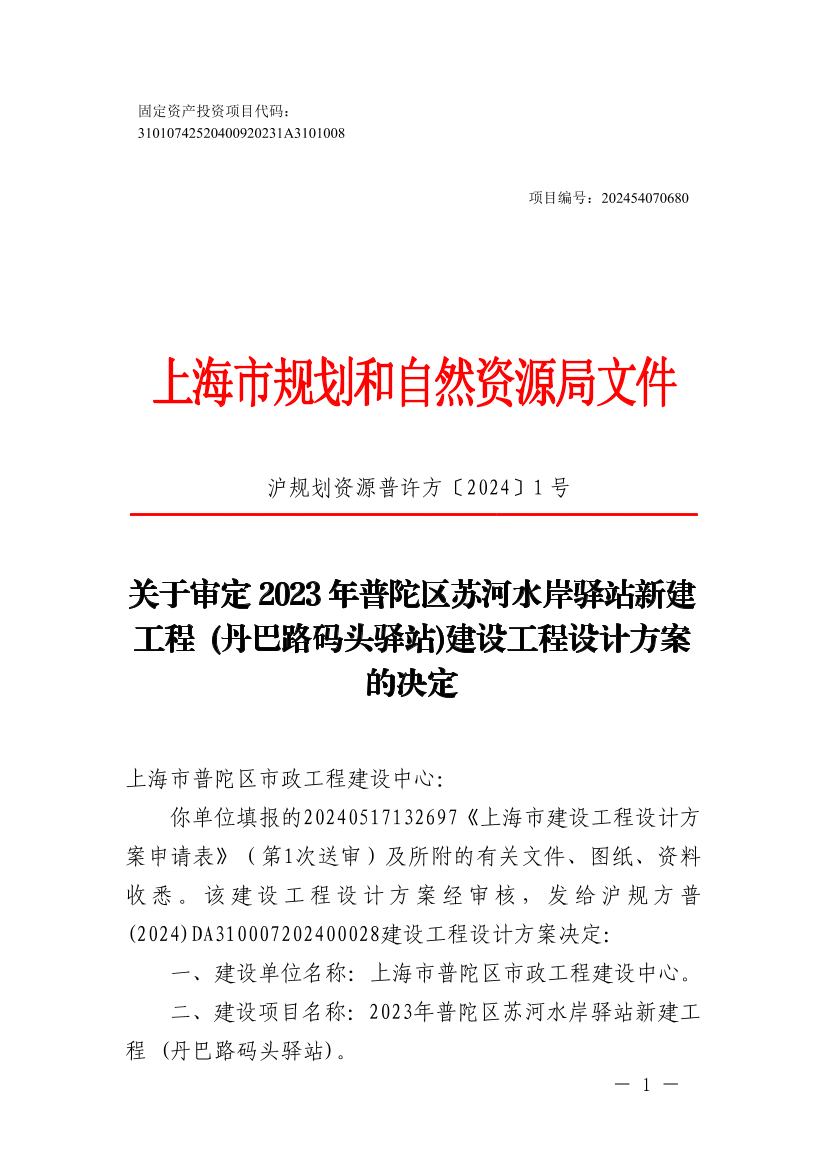 关于审定2023年普陀区苏河水岸驿站新建工程 (丹巴路码头驿站)建设工程设计方案的决定