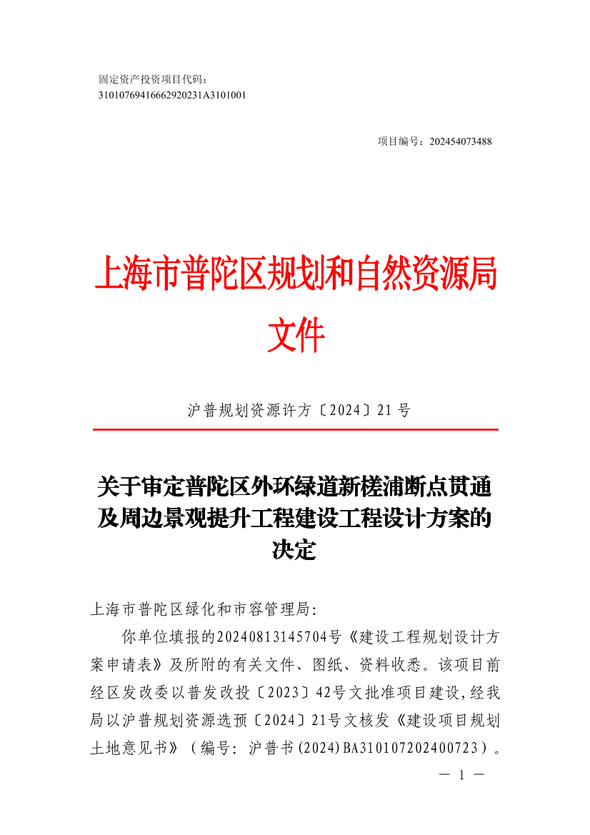 你单位填报的20240813145704号《建设工程规划设计方案申请表》及所附的有关文件、图纸、资料收悉。该项目前经区发改委以普发改投〔2023〕42号文批准项目建设,经我局以沪普规划资源选预〔2024〕21号文核发《建设项目规划土地意见书》(编号:沪普书(2024)BA310107202400723)。经审核,现同意发给(编号:沪普方(2024)DA310107202400658)建设工程设计方案决定,并将有关事项通知如下: