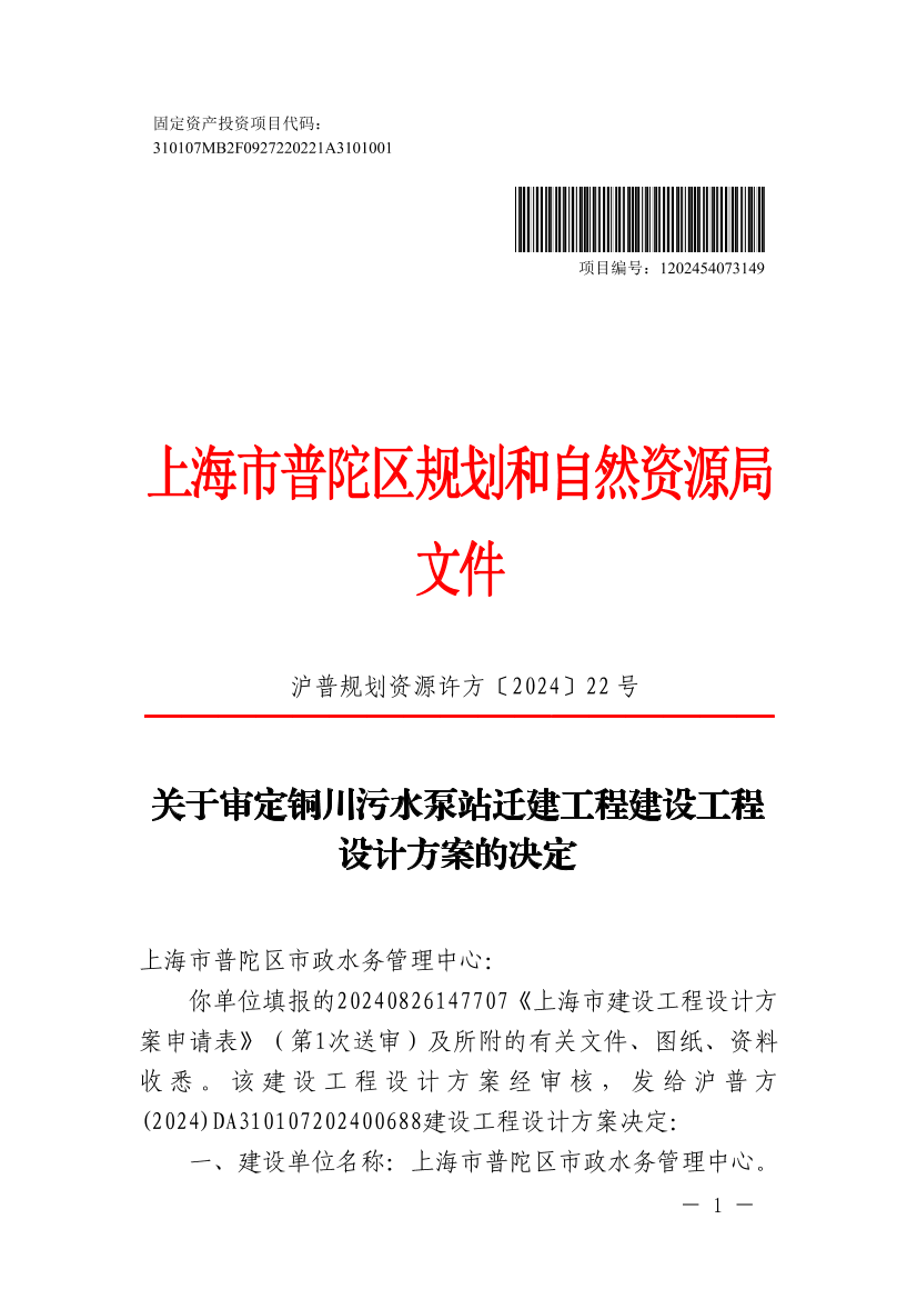 关于审定铜川污水泵站迁建工程建设工程设计方案的决定