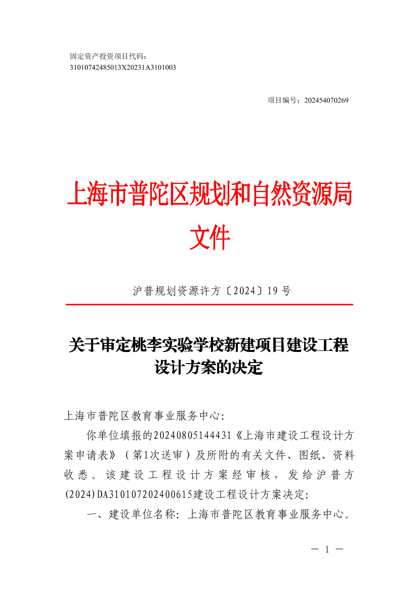 你单位填报的20240805144431《上海市建设工程设计方案申请表》(第1次送审)及所附的有关文件、图纸、资料收悉。该建设工程设计方案经审核,发给沪普方(2024)DA310107202400615建设工程设计方案决定:
