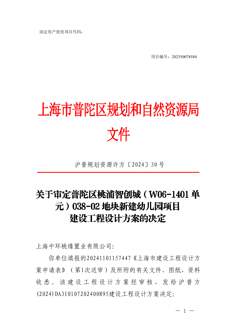 关于审定普陀区桃浦智创城(W06-1401单元)038-02地块新建幼儿园项目建设工程设计方案的决定