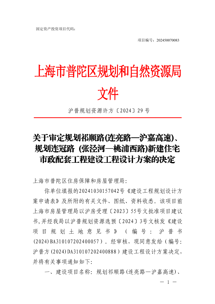 关于审定规划祁顺路(连亮路—沪嘉高速)、规划连冠路 (张泾河—桃浦西路)新建住宅市政配套工程建设工程设计方案的决定
