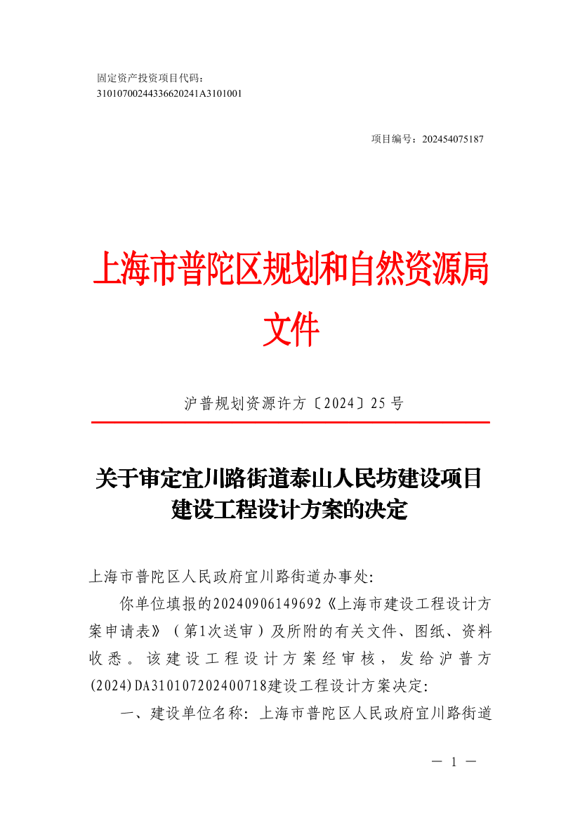 关于审定宜川路街道泰山人民坊建设项目建设工程设计方案的决定