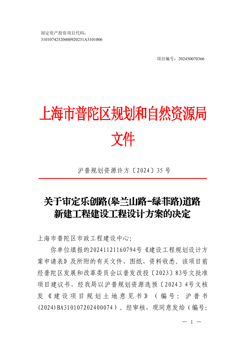 你单位填报的20241121160794号《建设工程规划设计方案申请表》及所附的有关文件、图纸、资料收悉。该项目前经普陀区发展和改革委员会以普发改投〔2023〕83号文批准项目建议书,经我局以沪普规划资源选预〔2024〕4号文核发《建设项目规划土地意见书》(编号:沪普书(2024)BA310107202400074)。经审核,现同意发给(编号:沪普方(2024)DA310107202400984)建设工程设计方案决定,并将有关事项通知如下: