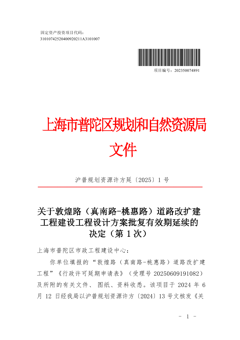 你单位填报的“敦煌路(真南路-桃惠路)道路改扩建工程”《行政许可延期申请表》(受理号20250609191082)及所附的有关文件、图纸、资料收悉。该项目于2024年6月12日经我局以沪普规划资源许方〔2024〕13号文核发《关于审定敦煌路(真南路-桃惠路)道路改扩建工程建设工程设计方案审批(线性工程)的决定》(沪普方(2024)DA310107202400438,以下简称《决定》),有效期一 年。现你单位(第1次)向我局提出延续《决定》有效期的申请。