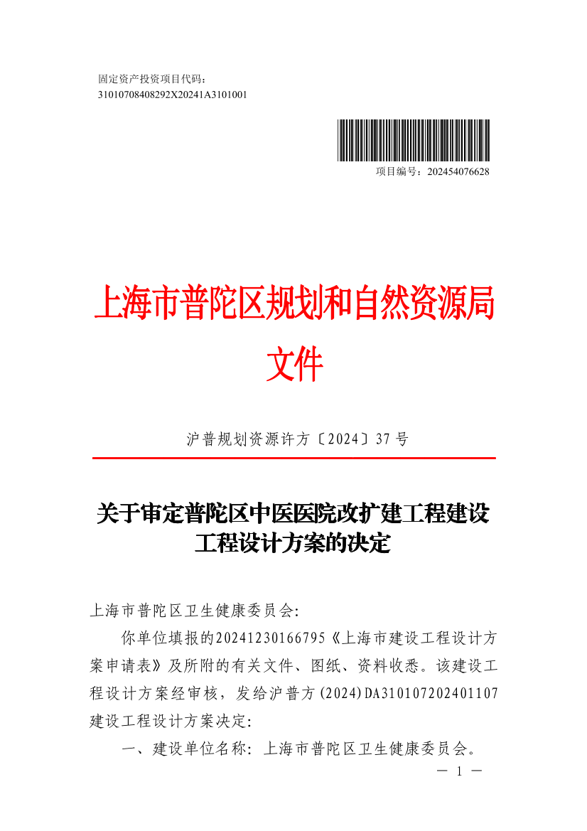 关于审定普陀区中医医院改扩建工程建设工程设计方案的决定