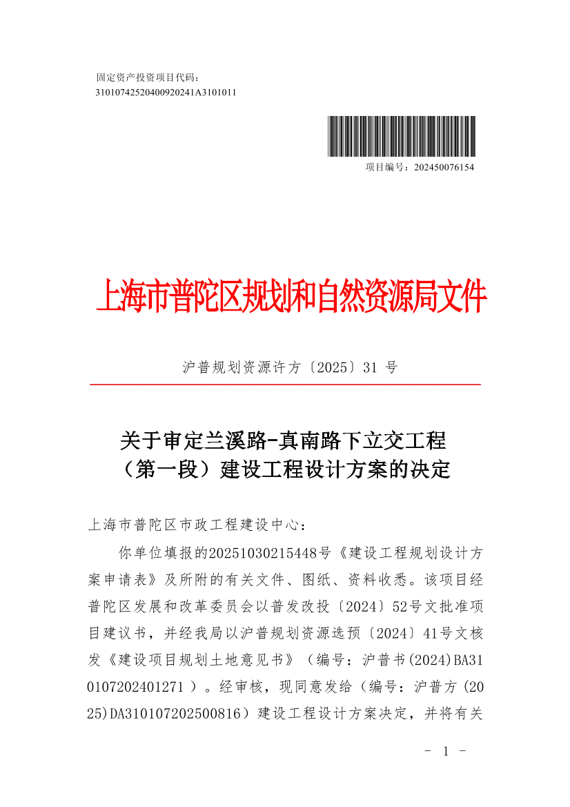 你单位填报的20251030215448号《建设工程规划设计方案申请表》及所附的有关文件、图纸、资料收悉。该项目经普陀区发展和改革委员会以普发改投〔2024〕52号文批准项目建议书,并经我局以沪普规划资源选预〔2024〕41号文核发《建设项目规划土地意见书》(编号:沪普书(2024)BA310107202401271)。经审核,现同意发给(编号:沪普方(2025)DA310107202500816)建设工程设计方案决定,并将有关事项通知如下: