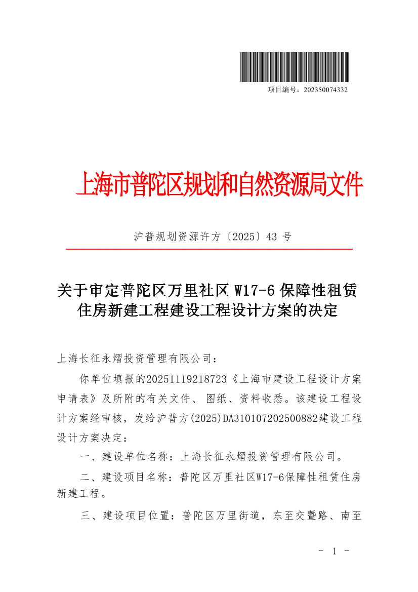 关于审定普陀区万里社区W17-6保障性租赁住房新建工程建设工程设计方案的决定