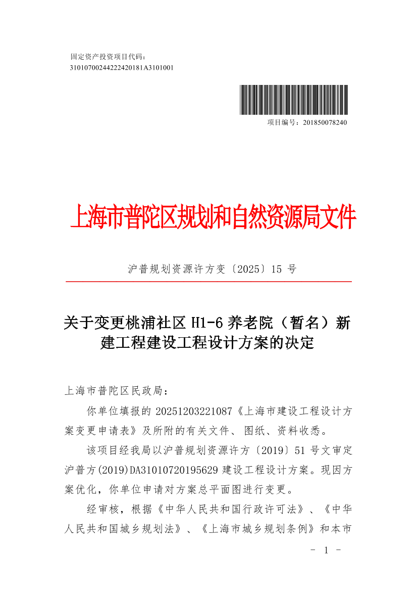 关于变更桃浦社区H1-6养老院(暂名)新建工程建设工程设计方案的决定