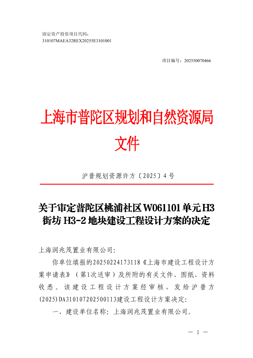 关于审定普陀区桃浦社区W061101单元H3街坊H3-2地块建设工程设计方案的决定