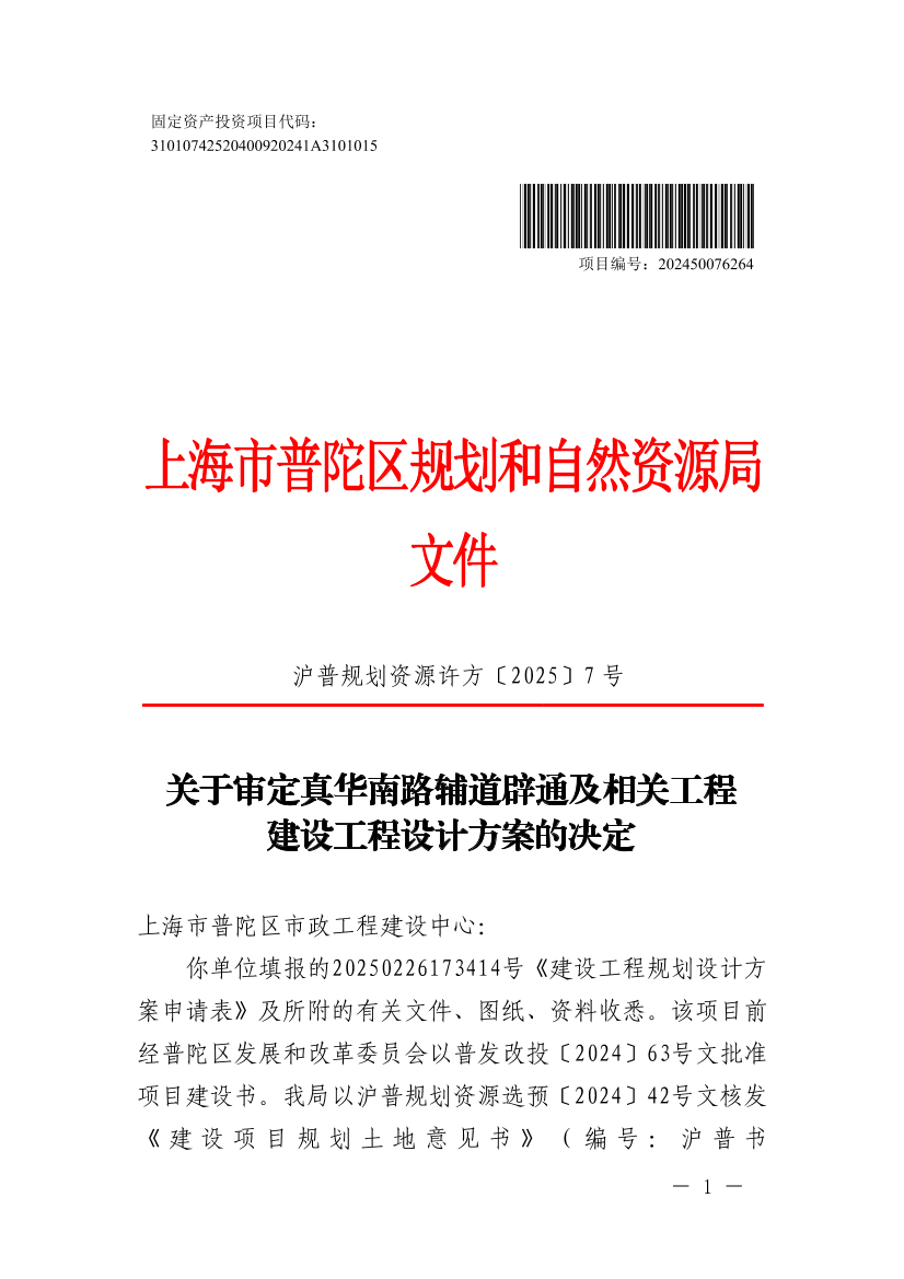 你单位填报的20250226173414号《建设工程规划设计方案申请表》及所附的有关文件、图纸、资料收悉。该项目前经普陀区发展和改革委员会以普发改投〔2024〕63号文批准项目建设书。我局以沪普规划资源选预〔2024〕42号文核发《建设项目规划土地意见书》(编号:沪普书(2024)BA310107202401273),经审核,现同意发给(编号:沪普方(2025)DA310107202500135)建设工程设计方案决定,并将有关事项通知如下:
