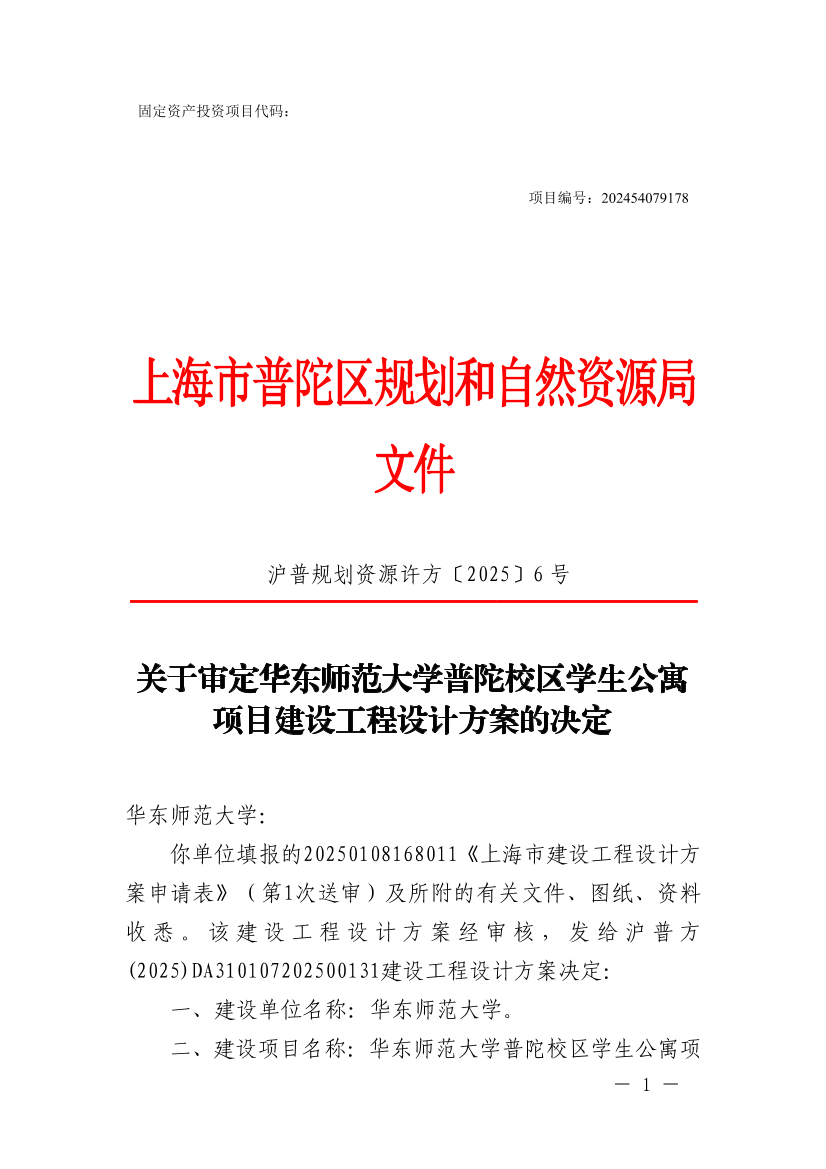 关于审定华东师范大学普陀校区学生公寓项目建设工程设计方案的决定