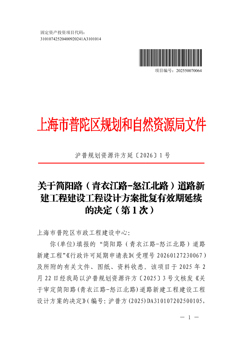 你(单位)填报的“简阳路(青衣江路-怒江北路)道路新建工程”《行政许可延期申请表》(受理号 20260127230067 )及所附的有关文件、图纸、资料收悉。该项目于2025年2月22日经我局以沪普规划资源许方〔2025〕3号文核发《关于审定简阳路(青衣江路-怒江北路)道路新建工程建设工程设计方案的决定》(编号:沪普方(2025)DA310107202500105,以下简称《决定》)。现你(单位)(第1次 )向我局提出延续《决定》有效期的申请。