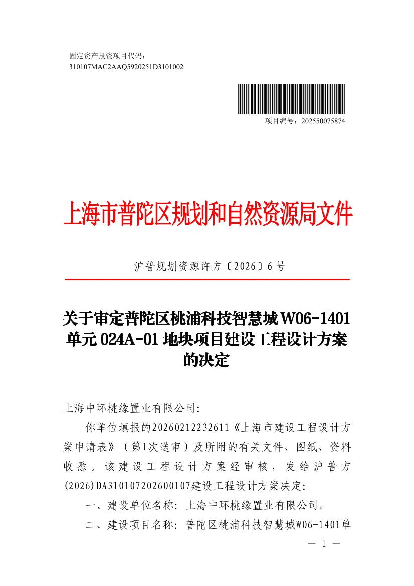 关于审定普陀区桃浦科技智慧城W06-1401单元024A-01地块项目建设工程设计方案的决定