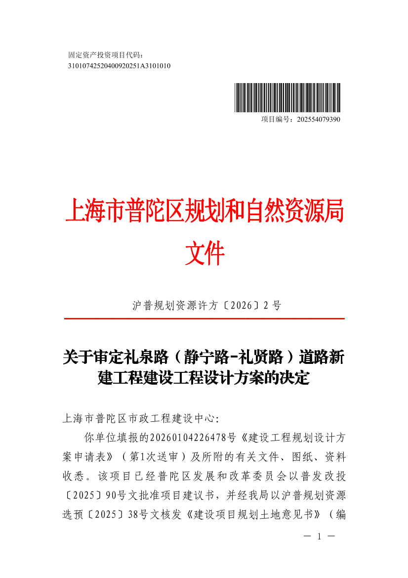 你单位填报的20260104226478号《建设工程规划设计方案申请表》( 第1次送审)及所附的有关文件、图纸、资料收悉。该项目已经普陀区发展和改革委员会以普发改投〔2025〕90号文批准项目建议书,并经我局以沪普规划资源选预〔2025〕38号文核发《建设项目规划土地意见书》(编号:沪普书(2025)BA310107202501084 )。经审核,现同意发给(编号:沪普方(2026)DA310107202600029)建设工程设计方案决定,并将有关事项通知如下: