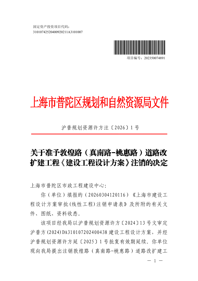 该项目经我局以沪普规划资源许方〔2024〕13号文审定沪普方(2024)DA310107202400438 建设工程设计方案,并经沪普规划资源许方延〔2025〕1号批复有效期延续。你单位现向我局提出注销敦煌路(真南路-桃惠路)道路改扩建工程建设工程设计方案的申请。