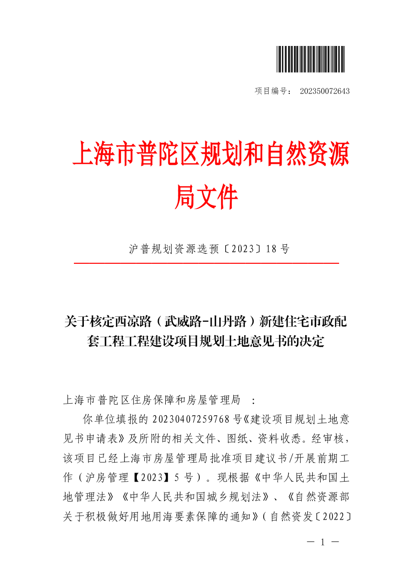 你单位填报的20230407259768号《建设项目规划土地意见书申请表》及所附的相关文件、图纸、资料收悉。经审核,该项目已经上海市房屋管理局批准项目建议书开展前期工作(沪房管理【2023】5号)。现根据《中华人民共和国土地管理法》《中华人民共和国城乡规划法》、《自然资源部关于积极做好用地用海要素保障的通知》(自然资发〔2022〕129号)、国家和本市国土空间规划管理有关规定和《上海市工程建设项目审批制度改革试点实施方案》等相关要求,同意核发《建设项目用地预审与选址意见书》(编号:沪普书(2023)BA310107202300383),并告知相关管理意见如下: