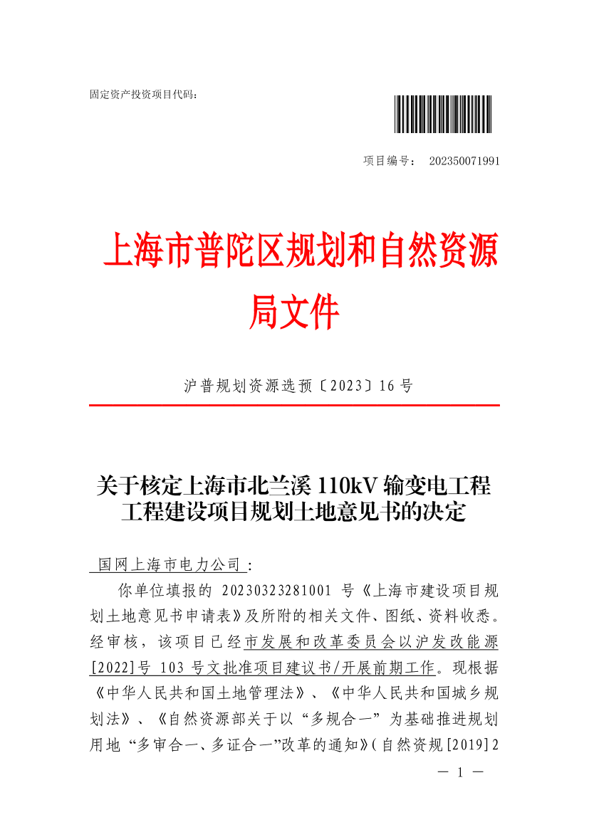 你单位填报的20230323281001号《上海市建设项目规划土地意见书申请表》及所附的相关文件、图纸、资料收悉。经审核,该项目已经市发展和改革委员会以沪发改能源[2022]号103号文批准项目建议书开展前期工作。现根据《中华人民共和国土地管理法》、《中华人民共和国城乡规划法》、《自然资源部关于以“多规合一”为基础推进规划用地“多审合一、多证合一”改革的通知》(自然资规[2019]2号)以及本市国土空间规划管理的有关规定,同意核发上海市北兰溪110kV输变电工程《建设项目选址意见书》(编号:沪普书(2023)BA310107202300292),并提出选址、用地预审意见如下: