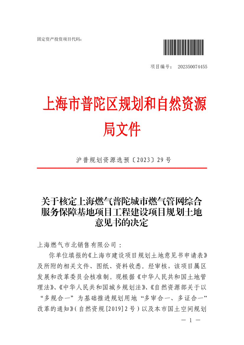 你单位填报的《上海市建设项目规划土地意见书申请表》及所附的相关文件、图纸、资料收悉。经审核,该项目属区发展和改革委员会核准制。现根据《中华人民共和国土地管理法》、《中华人民共和国城乡规划法》、《自然资源部关于以“多规合一”为基础推进规划用地“多审合一、多证合一”改革的通知》(自然资规[2019]2号)以及本市国土空间规划管理的有关规定,同意核发上海燃气普陀城市燃气管网综合服务保障基地项目《建设项目选址意见书》(编号:沪普书(2023)BA310107202300738),并提出选址(用地预审)意见如下: