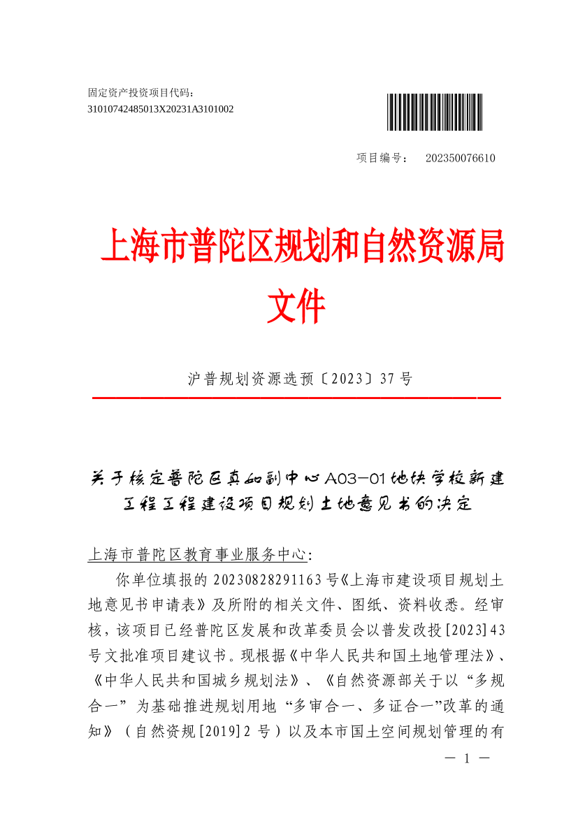 你单位填报的20230828291163号《上海市建设项目规划土地意见书申请表》及所附的相关文件、图纸、资料收悉。经审核,该项目已经普陀区发展和改革委员会以普发改投[2023]43号文批准项目建议书。现根据《中华人民共和国土地管理法》、《中华人民共和国城乡规划法》、《自然资源部关于以“多规合一”为基础推进规划用地“多审合一、多证合一”改革的通知》(自然资规[2019]2号)以及本市国土空间规划管理的有关规定,同意核发普陀区真如副中心A03-01地块学校新建工程《建设项目选址意见书》(编号:沪普规划资源选预(2023)BA310107202301099),并提出选址(用地预审)意见如下: