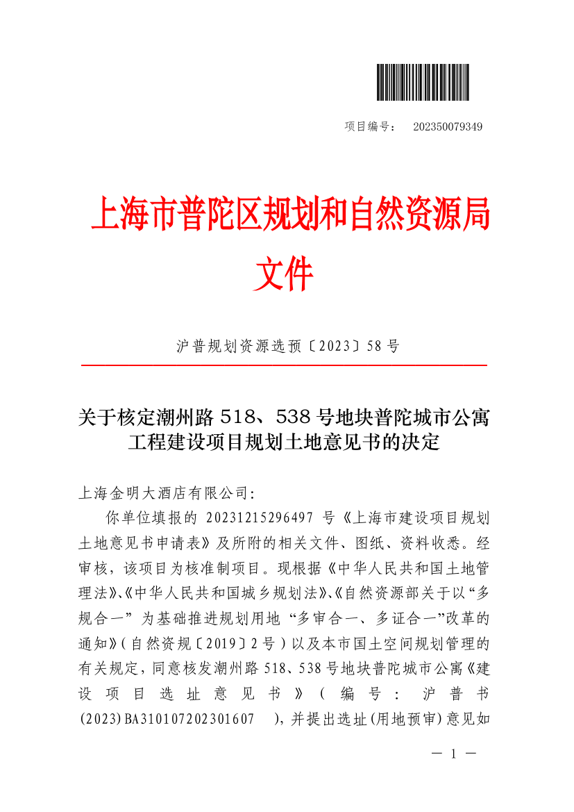 关于核定潮州路518、538号地块普陀城市公寓工程建设项目规划土地意见书的决定