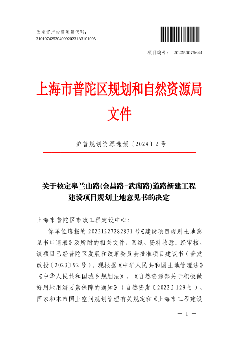 你单位填报的20231227282831号《建设项目规划土地意见书申请表》及所附的相关文件、图纸、资料收悉。经审核,该项目已经普陀区发展和改革委员会批准项目建议书(普发改投〔2023〕92号)。现根据《中华人民共和国土地管理法》《中华人民共和国城乡规划法》、《自然资源部关于积极做好用地用海要素保障的通知》(自然资发〔2022〕129号)、国家和本市国土空间规划管理有关规定和《上海市工程建设项目审批制度改革试点实施方案》等相关要求,同意核发《建设项目用地预审与选址意见书》(编号:沪普书(2024)BA310107202400039),并告知相关管理意见如下: