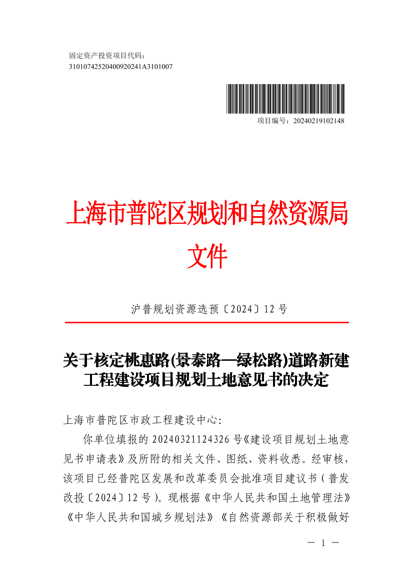 你单位填报的20240321124326号《建设项目规划土地意见书申请表》及所附的相关文件、图纸、资料收悉。经审核,该项目已经普陀区发展和改革委员会批准项目建议书(普发改投〔2024〕12号)。现根据《中华人民共和国土地管理法》《中华人民共和国城乡规划法》《自然资源部关于积极做好用地用海要素保障的通知》(自然资发〔2022〕129号)、国家和本市国土空间规划管理有关规定和《上海市工程建设项 目审批制度改革试点实施方案》等相关要求,同意核发桃惠路(景泰路—绿松路)道路新建工程《建设项目用地预审与选址意见书》(编号:沪普书(2024)BA310107202400397),并告知相关管理意见如下: