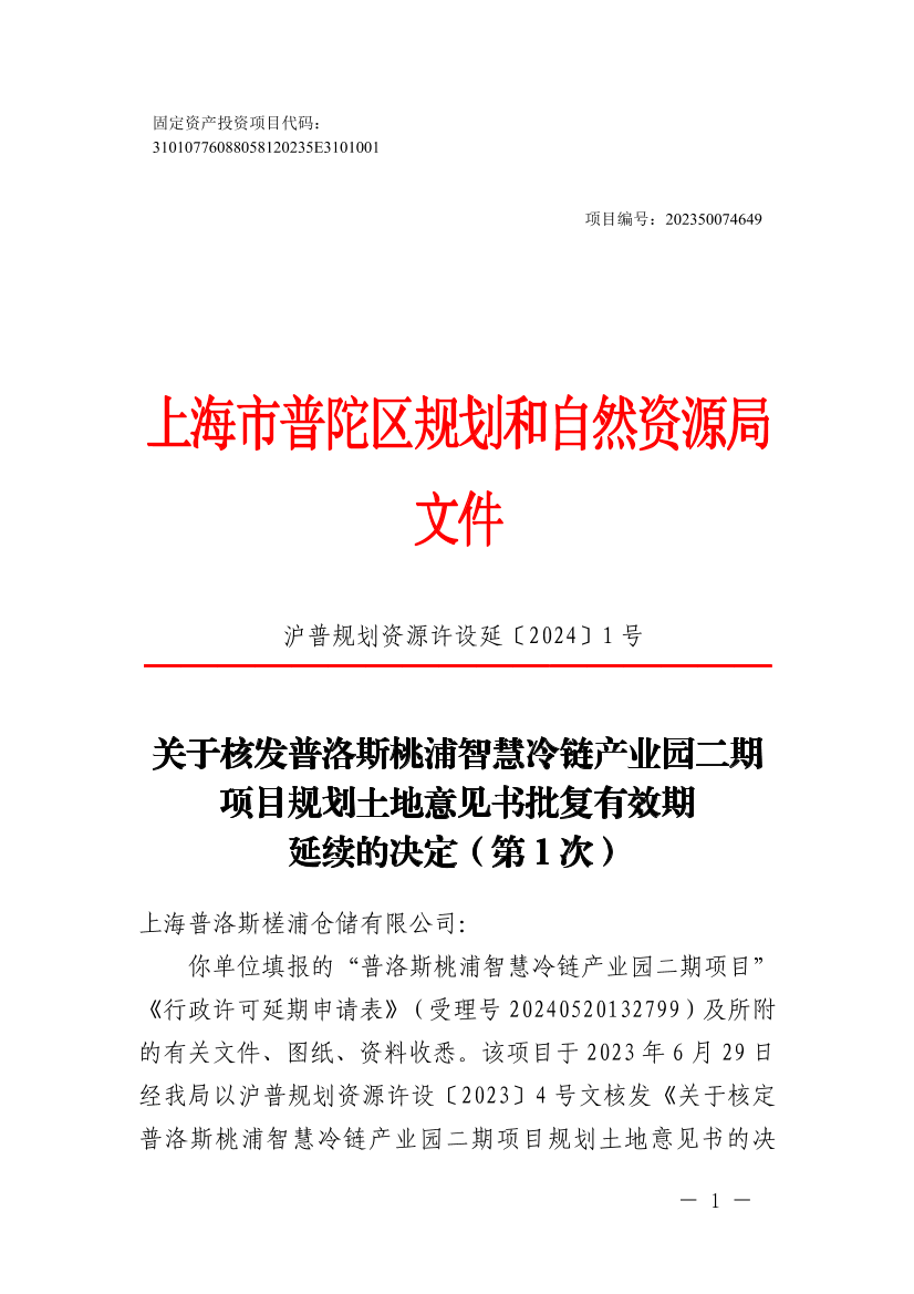 你单位填报的“普洛斯桃浦智慧冷链产业园二期项目”《行政许可延期申请表》(受理号20240520132799)及所附的有关文件、图纸、资料收悉。该项目于2023年6月29日经我局以沪普规划资源许设〔2023〕4号文核发《关于核定普洛斯桃浦智慧冷链产业园二期项目规划土地意见书的决定》(证号:沪普设(2023)CA310107202300175,以下简称《决定》)。并以沪普规划资源许设延〔2024〕1号同意该《决定》有效期延续,现你单位(第1次)向我局提出延续《决定》有效期的申请。