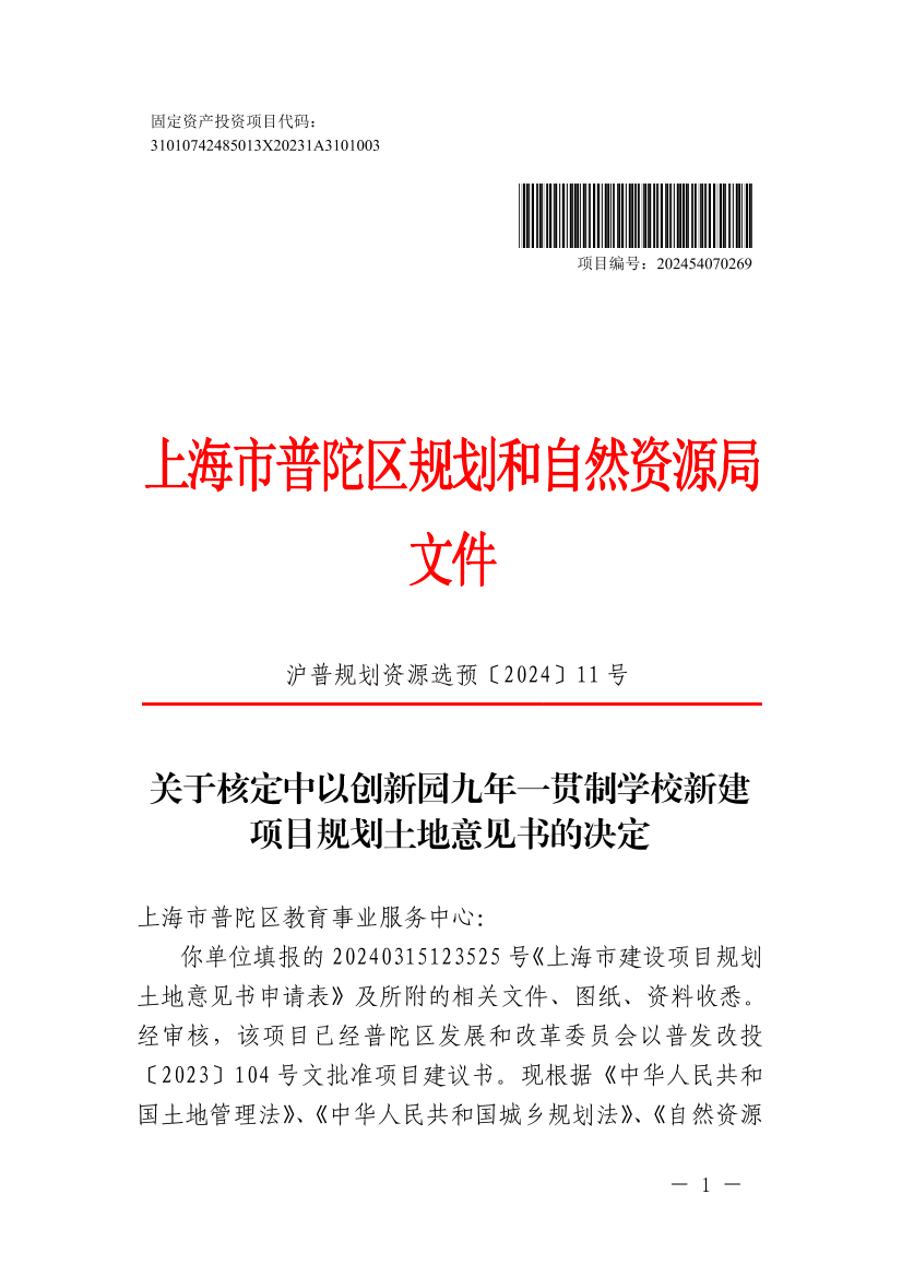 你单位填报的20240315123525号《上海市建设项目规划土地意见书申请表》及所附的相关文件、图纸、资料收悉。经审核,该项目已经普陀区发展和改革委员会以普发改投〔2023〕104号文批准项目建议书。现根据《中华人民共和国土地管理法》、《中华人民共和国城乡规划法》、《自然资源部关于以“多规合一”为基础推进规划用地“多审合一、多证合一”改革的通知》(自然资规〔2019〕2号)以及本市国土空间规划管理的有关规定,同意核发中以创新园九年一贯制学校新建项目《建设项目选址意见书》(编号:沪普书(2024)BA310107202400374),并提出选址(用地预审)意见如下: