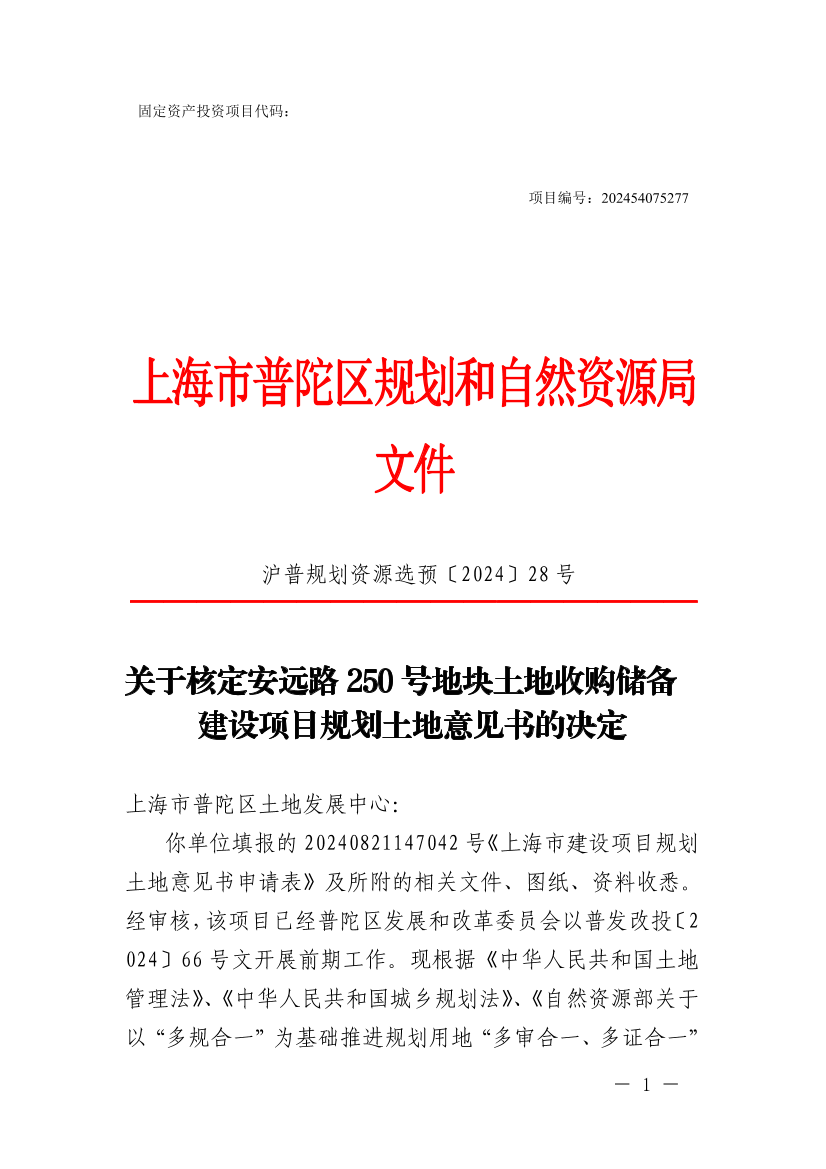 经审核,该项目已经普陀区发展和改革委员会以普发改投〔2024〕66号文开展前期工作。现根据《中华人民共和国土地管理法》、《中华人民共和国城乡规划法》、《自然资源部关于以“多规合一”为基础推进规划用地“多审合一、多证合一”改革的通知》( 自然资规〔2019〕2号)以及本市国土空间规划管理的有关规定,同意核发安远路250号地块土地收购储备《建设项目选址意见书》(编号:沪普书(2024)BA310107202401029),并提出选址(用地预审)意见如下: