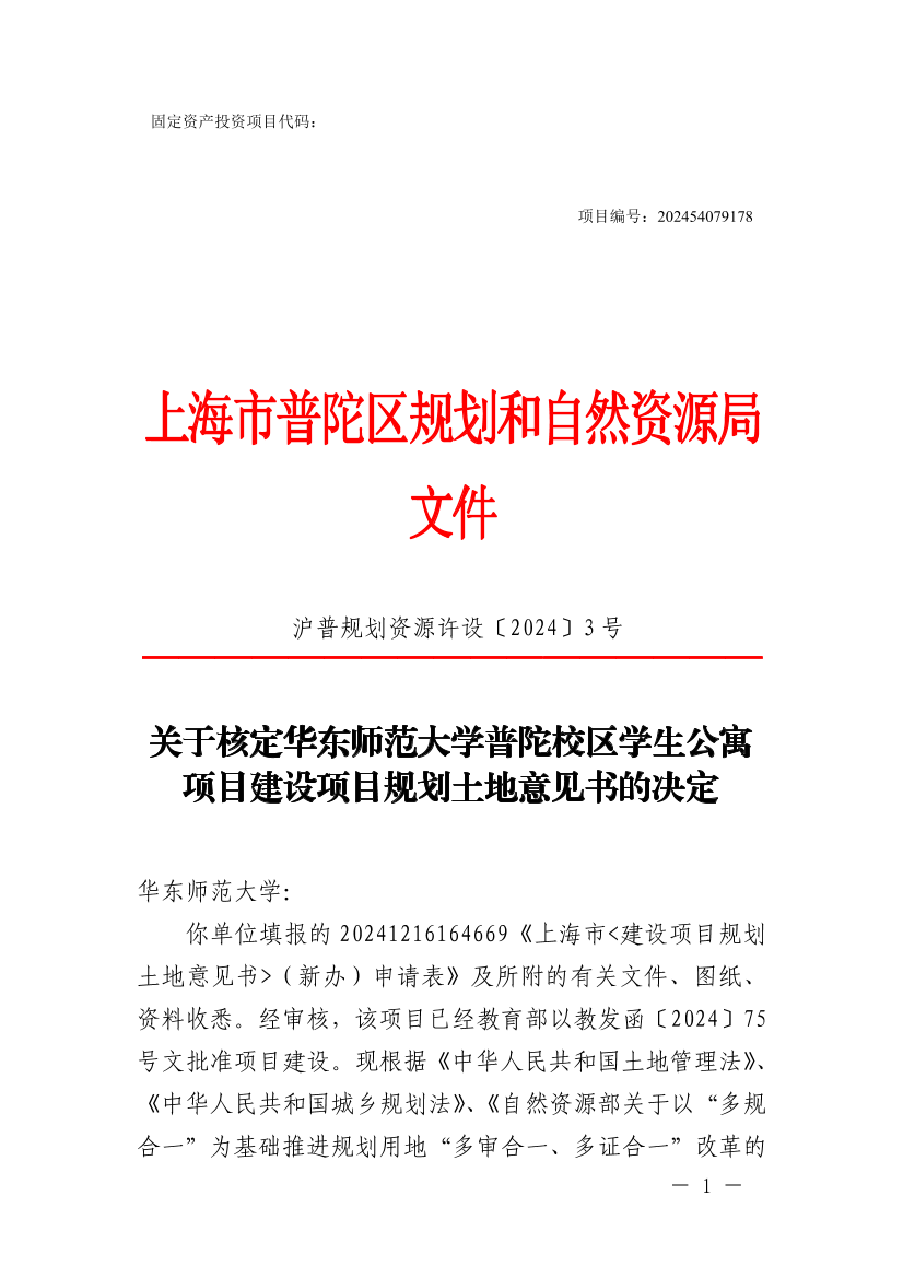 你单位填报的20241216164669《上海市<建设项目规划土地意见书>(新办)申请表》及所附的有关文件、图纸、资料收悉。经审核,该项目已经教育部以教发函〔2024〕75号文批准项目建设。现根据《中华人民共和国土地管理法》、《中华人民共和国城乡规划法》、《自然资源部关于以“多规合一”为基础推进规划用地“多审合一、多证合一”改革的通知》( 自然资规〔2019〕2号)、《上海市工程建设项目审批制度改革试点实施方案》以及本市国土空间规划管理的有关规定,同意核定华东师范大学普陀校区学生公寓项目建设项目规划土地意见书(编号:沪普设(2024)CA310107202400311 ),并告知相关管理意见如下:
