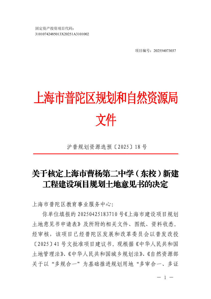 你单位填报的20250425183710号《上海市建设项目规划土地意见书申请表》及所附的相关文件、图纸、资料收悉。经审核,该项目已经普陀区发展和改革委员会以普发改投〔2025〕41号文批准项目建议书。现根据《中华人民共和国土地管理法》、《中华人民共和国城乡规划法》、《自然资源部关于以“多规合一”为基础推进规划用地“多审合一、多证合一”改革的通知》(自然资规〔2019〕2号)以及本市国土空间规划管理的有关规定,同意核发上海市曹杨第二中学(东校)新建工程《建设项目选址意见书》(编号:沪普书(2025)BA310107202500387),并提出选址(用地预审)意见如下: