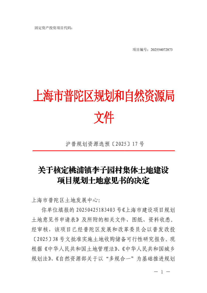 你单位填报的20250425183403号《上海市建设项目规划土地意见书申请表》及所附的相关文件、图纸、资料收悉。经审核,该项目已经普陀区发展和改革委员会以普发改投〔2025〕38号文批准实施土地收购储备可行性研究报告。现根据《中华人民共和国土地管理法》、《中华人民共和国城乡规划法》、《自然资源部关于以“多规合一”为基础推进规划用地“多审合一、多证合一”改革的通知》(自然资规〔2019〕2号)以及本市国土空间规划管理的有关规定,同意核发桃浦镇李子园村集体土地《建设项目选址意见书》(编号:沪普书(2025)BA310107202500385),并提出选址(用地预审)意见如下: