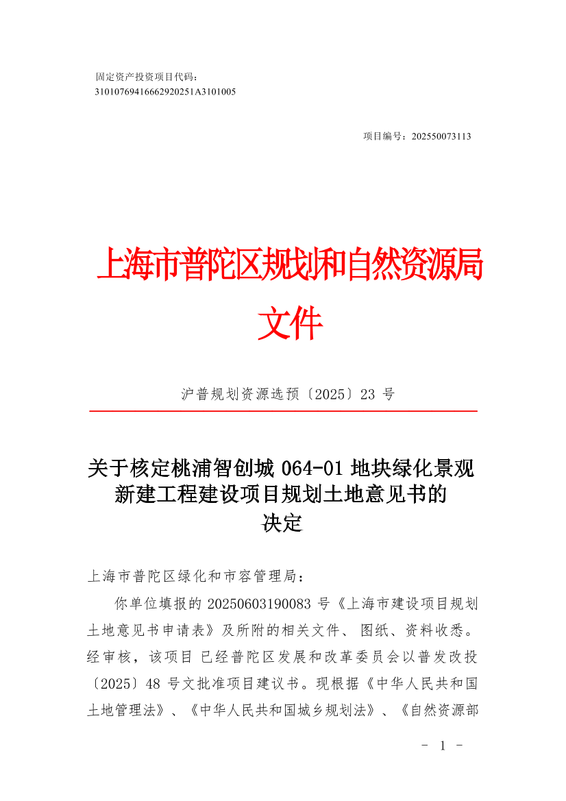 你单位填报的20250603190083号《上海市建设项目规划土地意见书申请表》及所附的相关文件、图纸、资料收悉。经审核,该项目已经普陀区发展和改革委员会以普发改投〔2025〕48号文批准项目建议书。现根据《中华人民共和国土地管理法》、《中华人民共和国城乡规划法》、《自然资源部关于以“多规合一”为基础推进规划用地“多审合一、多证合一”改革的通知》(自然资规〔2019〕2号)以及本市国土空间规划管理的有关规定,同意核发桃浦智创城064-01地块绿化景观新建工程《建设项目选址意见书》(编号:沪普书(2025)BA310107202500511),并提出选址(用地预审)意见如下: