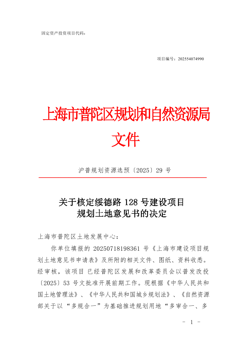 你单位填报的20250718198361号《上海市建设项目规划土地意见书申请表》及所附的相关文件、图纸、资料收悉。经审核,该项目已经普陀区发展和改革委员会以普发改投〔2025〕53号文批准开展前期工作。现根据《中华人民共和国土地管理法》、《中华人民共和国城乡规划法》、《自然资源部关于以“多规合一”为基础推进规划用地“多审合一、多证合一”改革的通知》(自然资规〔2019〕2号)以及本市国土空间规划管理的有关规定,同意核发绥德路128号《建设项目选址意见书》(编号:沪普书(2025)BA310107202500688),并提出选址(用地预审)意见如下: