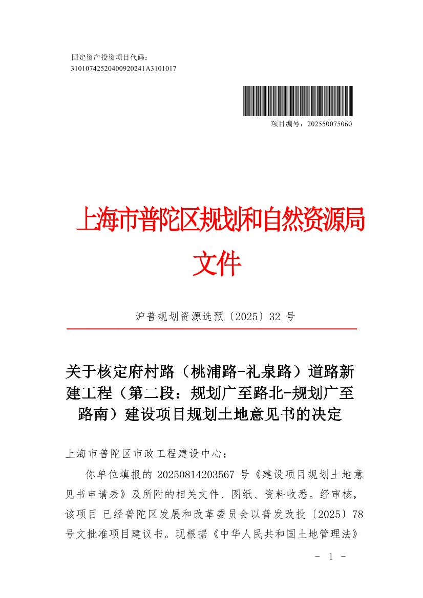 你单位填报的20250814203567号《建设项目规划土地意见书申请表》及所附的相关文件、图纸、资料收悉。经审核,该项目已经普陀区发展和改革委员会以普发改投〔2025〕78号文批准项目建议书。现根据《中华人民共和国土地管理法》《中华人民共和国城乡规划法》《自然资源部关于进一步做好用地用海要素保障的通知》(自然资发〔2023〕89号)、国家和本市国土空间规划管理有关规定和《上海市工程建设项目审批制度改革试点实施方案》等相关要求,同意核发府村路(桃浦路-礼泉路)道路新建工程(第二段:规划广至路北-规划广至路南)《建设项目用地预审与选址意见书》(编号:沪普书(2025)BA310107202500821),并告知相关管理意见如下: