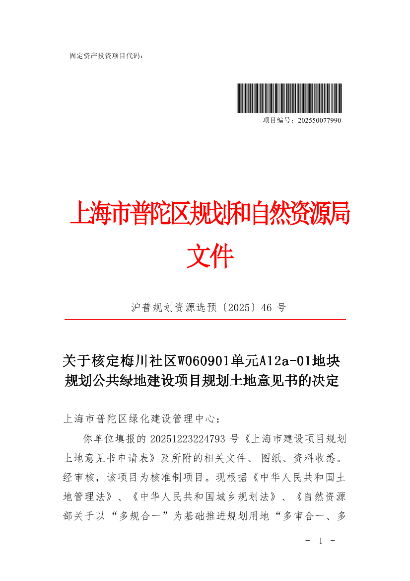 你单位填报的20251223224793号《上海市建设项目规划土地意见书申请表》及所附的相关文件、图纸、资料收悉。经审核,该项目为核准制项目。现根据《中华人民共和国土地管理法》、《中华人民共和国城乡规划法》、《自然资源部关于以“多规合一”为基础推进规划用地“多审合一、多证合一”改革的通知》(自然资规〔2019〕2号)以及本市国土空间规划管理的有关规定,同意核发梅川社区W060901单元A12a-01地块规划公共绿地建设项目《建设项目选址意见书》(编号:沪普书(2025)BA310107202501274),并提出选址(用地预审)意见如下: