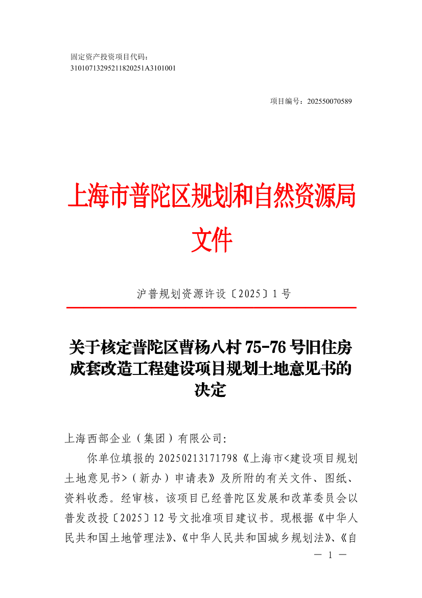 你单位填报的20250213171798《上海市<建设项目规划土地意见书>(新办)申请表》及所附的有关文件、图纸、资料收悉。经审核,该项目已经普陀区发展和改革委员会以普发改投〔2025〕12号文批准项目建议书。现根据《中华人民共和国土地管理法》、《中华人民共和国城乡规划法》、《自然资源部关于以“多规合一”为基础推进规划用地“多审合一、多证合一”改革的通知》(自然资规〔2019〕2号)、《上海市工程建设项目审批制度改革试点实施方案》以及本市国土空间规划管理的有关规定,同意核定普陀区曹杨八村75-76号旧住房成套改造工程建设项目规划土地意见书(编号:沪普设(2025)CA310107202500043),并告知相关管理意见如下: