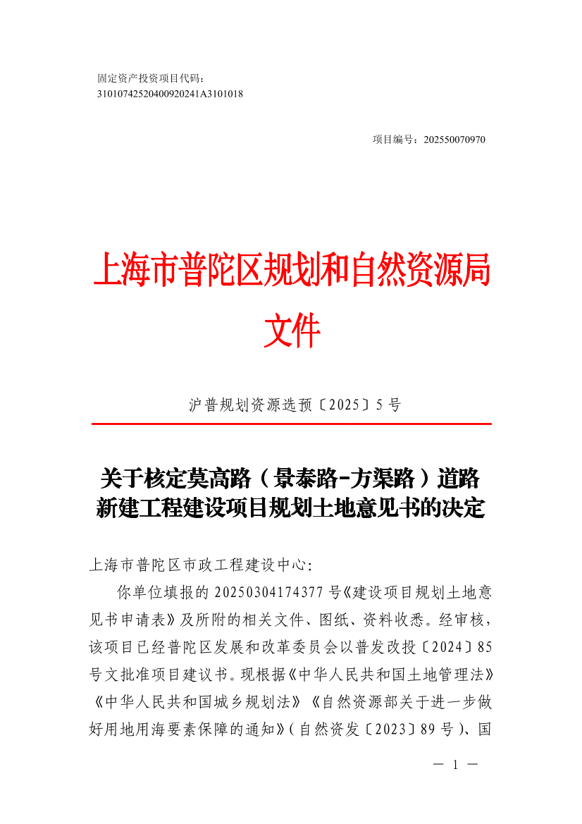 你单位填报的20250304174377 号《建设项目规划土地意见书申请表》及所附的相关文件、图纸、资料收悉。经审核,该项目已经普陀区发展和改革委员会以普发改投〔2024〕85号文批准项目建议书。现根据《中华人民共和国土地管理法》《中华人民共和国城乡规划法》《自然资源部关于进一步做好用地用海要素保障的通知》(自然资发〔2023〕89号)、国家和本市国土空间规划管理有关规定和《上海市工程建设项目审批制度改革试点实施方案》等相关要求,同意核发莫高路(景泰路-方渠路)道路新建工程《建设项目用地预审与选址意见书》(编号:沪普书(2025)BA310107202500168),并告知相关管理意见如下: