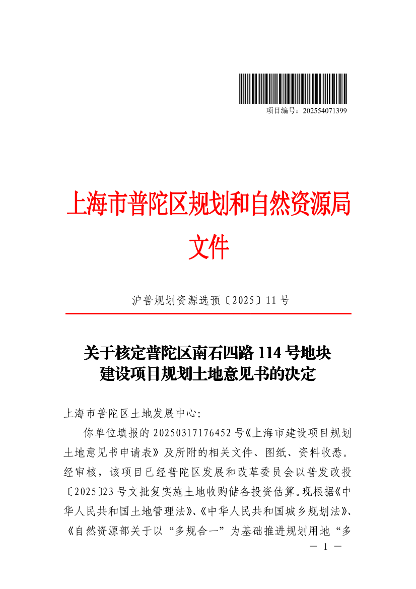 你单位填报的20250317176452号《上海市建设项目规划土地意见书申请表》及所附的相关文件、图纸、资料收悉。经审核,该项目已经普陀区发展和改革委员会以普发改投〔2025〕23号文批复实施土地收购储备投资估算。现根据《中华人民共和国土地管理法》、《中华人民共和国城乡规划法》、《自然资源部关于以“多规合一”为基础推进规划用地“多审合一、多证合一”改革的通知》(自然资规〔2019〕2号)以及本市国土空间规划管理的有关规定,同意核发普陀区南石四路114号地块《建设项目选址意见书》(编号:沪普书(2025)BA310107202500232),并提出选址(用地预审)意见如下: