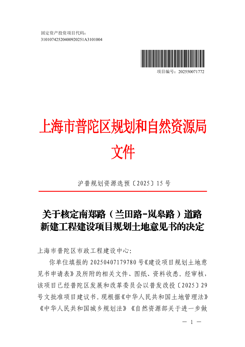 你单位填报的20250407179780号《建设项目规划土地意见书申请表》及所附的相关文件、图纸、资料收悉。经审核,该项目已经普陀区发展和改革委员会以普发改投〔2025〕29号文批准项目建议书。现根据《中华人民共和国土地管理法》《中华人民共和国城乡规划法》《自然资源部关于进一步做好用地用海要素保障的通知》(自然资发〔2023〕89号)、国家和本市国土空间规划管理有关规定和《上海市工程建设项目审批制度改革试点实施方案》等相关要求,同意核发南郑路(兰田路-岚皋路)道路新建工程《建设项目用地预审与选址意见书》(编号:沪普书(2025)BA310107202500308),并告知相关管理意见如下: